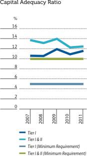 The Bank’s gross non-performing ratio improved to 3.43% in 2011, from 4.22% in the previous year. This decrease can be linked to improved macroeconomic conditions, rigorous recovery efforts and the Bank’s substantial credit growth over the year. Provision cover and open credit exposure ratios of 39.53% and 14.26% respectively recorded substantial improvements of 5.48% and 4.35% compared to the previous year. Additional provisions made on prudential basis also helped to improve these ratios.