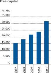 Due to the prudent policies adopted over the time, the Bank was able to buildup shareholders‘ funds and free capital derived thereon which stood at Rs. 44.26 Bn. and Rs. 31.61 Bn. respectively, as at December 31, 2011. These are considered to be the highest among local private Banks.