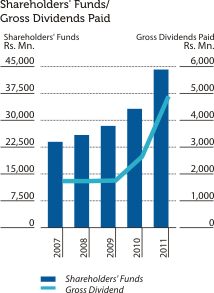 The Bank’s dividend policy, designed to maximise shareholders’ wealth, has an impact on cash dividend distribution. In framing its distribution strategy, the Bank considers factors such as profits, profitability, stability of earnings, rate of growth and opportunities for investment. Gearing level and regulatory requirements are also considered. In support of this approach, the Bank distributed two interim dividends (for both voting and non-voting shares) in November and December 2011, amounting to Rs. 1.50 per share and Rs. 1.00 per share respectively. The Directors have recommended a final dividend of Rs. 3.50 per share for year 2011, which consists of a cash dividend of Rs. 1.50 per share and the balance entitlement of Rs. 2.00 per share satisfied in the form of issue and allotment of new shares, subject to the approval of the shareholders at the forthcoming Annual General Meeting. The dividend payout ratio in the form of cash dividend amounted to 40.63% in 2011 from 34.20% in 2010. The total dividend including the dividend satisfied in the form of issue and allotment of new shares will result in a payout ratio of 60.94%, compared to 47.91% in 2010. The Bank remains mindful of the dividend structure’s impact on capital and future growth rates, and therefore manages the entire process with great care.