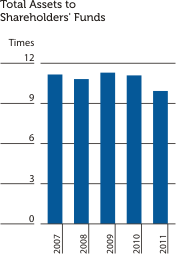 A dividend of Rs. 2.00 per share satisfied in the form of issue and allotment of shares was declared for 2010, which resulted in a capital infusion of Rs. 681 Mn. in April 2011. The Bank increased its stated capital by Rs. 4.86 Bn. in the third quarter through a rights issue of one new share for every existing 14 shares. Subsequent to this, the Bank announced a 1:1 share split, doubling the total number of shares, a measure that created additional market liquidity for the Bank’s shares. As a consequence of these developments, stated capital grew by 52.38% to Rs 16.47 Bn., up from Rs. 10.81 Bn. in 2010. Total shareholders’ funds also increased due to retained earnings. This included a reserve of Rs. 1.19 Bn. resulting from the funds transferred to the Investment Fund Account, being the taxes saved as proposed in the Government’s 2011 Budget. According to the budget guidelines, banks are required to transfer 8% of savings resulting from the Financial VAT rate reduction and 5% of savings from the corporate tax reduction to an Investment Fund Account, the funds of which can be utilised for activities specified by the Central Bank.