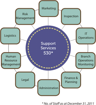 Several Commercial Bank divisions provide support services to help the Bank operate more efficiently and fulfill its mandate to customers and investors. The main such supporting divisions with the total number of staff attached to all divisions are shown in the following diagram.