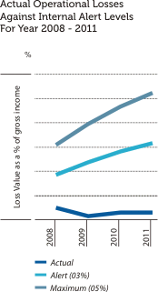 The Bank has a low appetite for material risks it is exposed to. Based on various factors such as historical loss data, budgets and forecasts, performances, existing systems and controls, observations of supervisory authorities on banking operations etc., the Bank has established tolerance levels for Operational Risk losses. Accordingly, alert level at 3% of the average audited gross income for the last three years and maximum level of 5% of the same has been established (refer Graph III). Further, these tolerance levels were segregated among types of Operational Losses to facilitate effective monitoring and control.