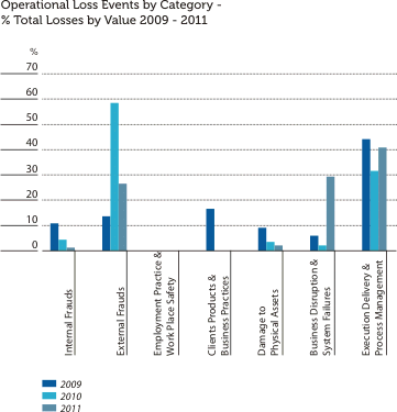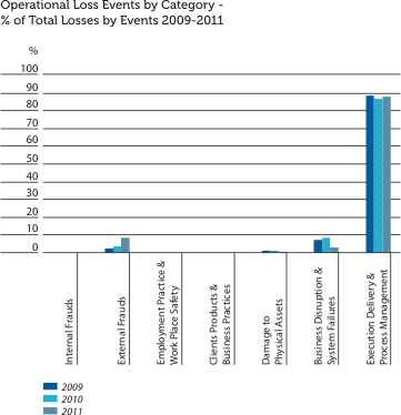 Meanwhile Execution, Delivery & Process Management also count for the highest percentage losses followed by business Disruptions and External Frauds (refer Graph II). However, gross value of the total Operational Losses for the year 2011 (which includes near miss events) as a percentage of average gross income for the last three years (based on the income taken for the calculation of capital requirement for Operational Risk) is a mere 0.28%. The Bank maintains these figures at extremely lower levels compared to the mandatory capital allocation of 15% under ‘Basic Indicator Approach’ of capital computation as per Basel II, mainly due to the application of sound and effective systems and controls.